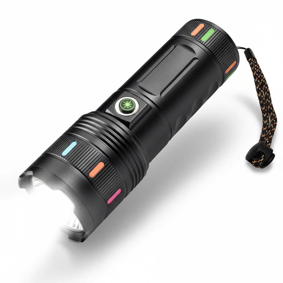 Equipada con baterías recargables de alta capacidad y sistema de carga rápida USB-C, esta linterna ofrece autonomía prolongada y comodidad de recarga. Su diseño resistente al agua permite utilizarla bajo lluvia o en entornos húmedos sin inconvenientes.